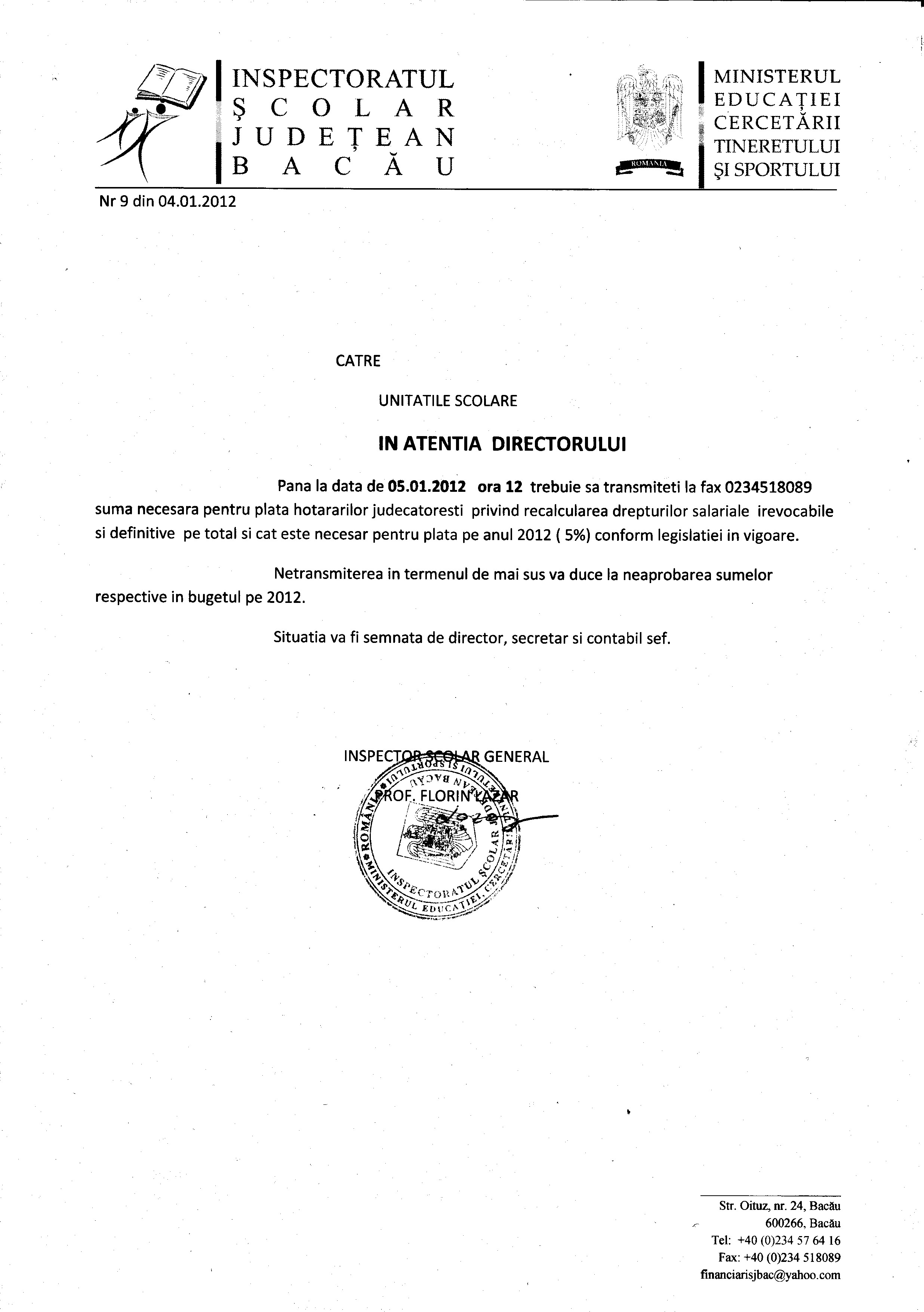 IMPORTANT! URGENT! IN ATENTIA DIRECTORILOR SI CONTABILILOR SEFI DIN UNITATILE DE INVATAMANT PREUNIVERSITAR DIN JUDETUL BACAU