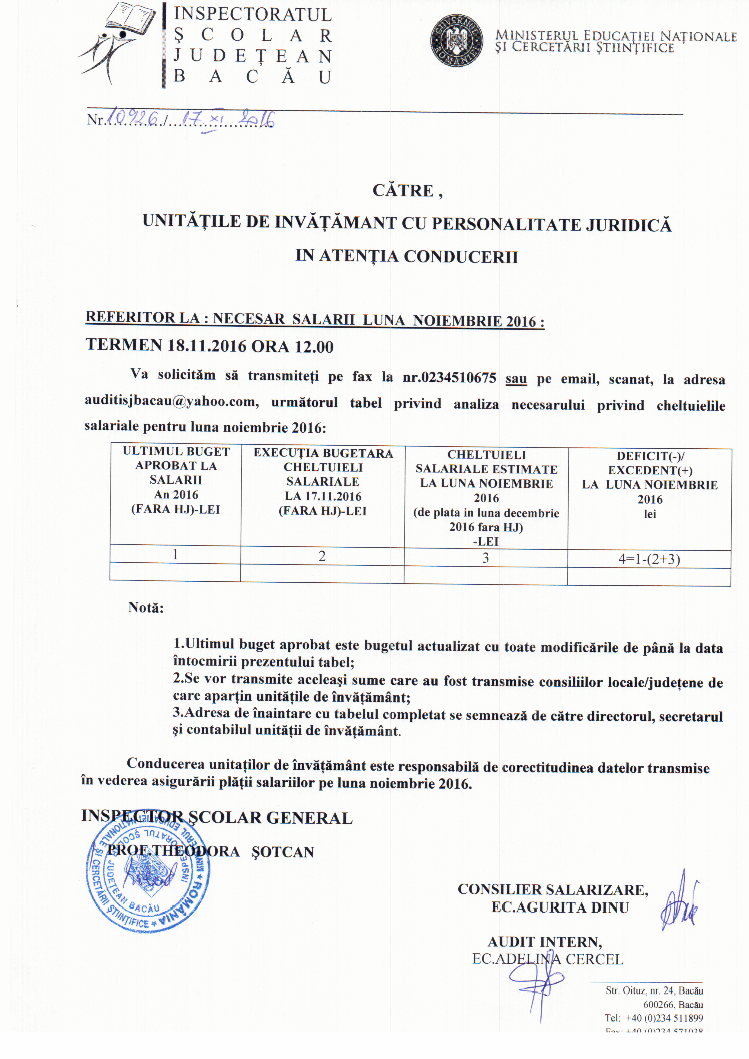 În atenția unităților de învățământ ! Necesar salarii luna noiembrie 2016