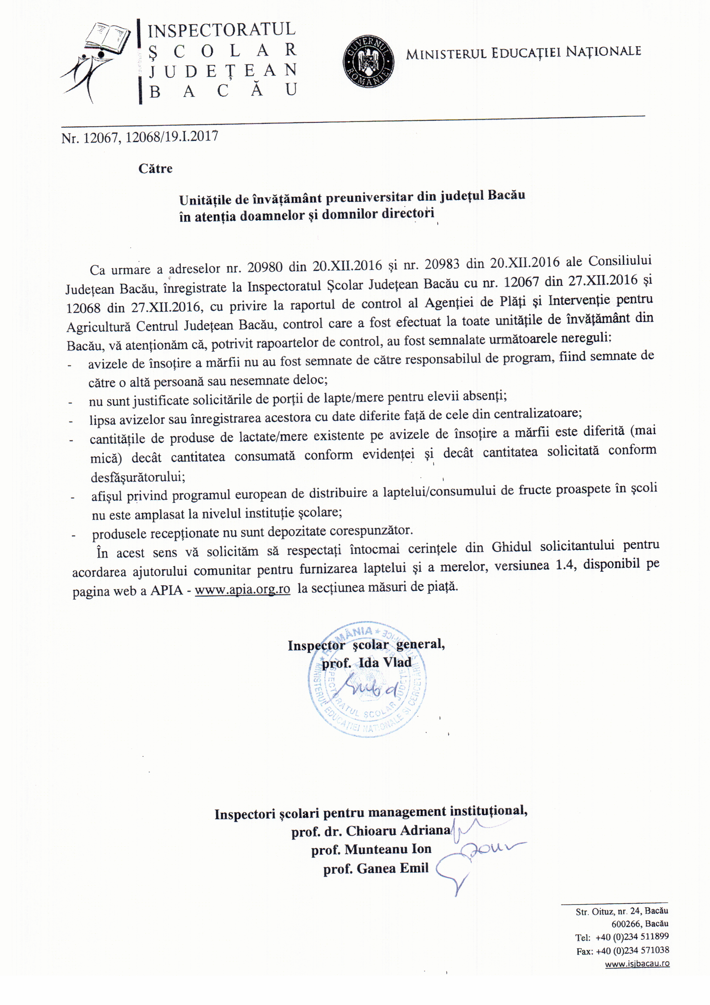 In atentia unitatilor de invatamant- raport control APIA Bacău
