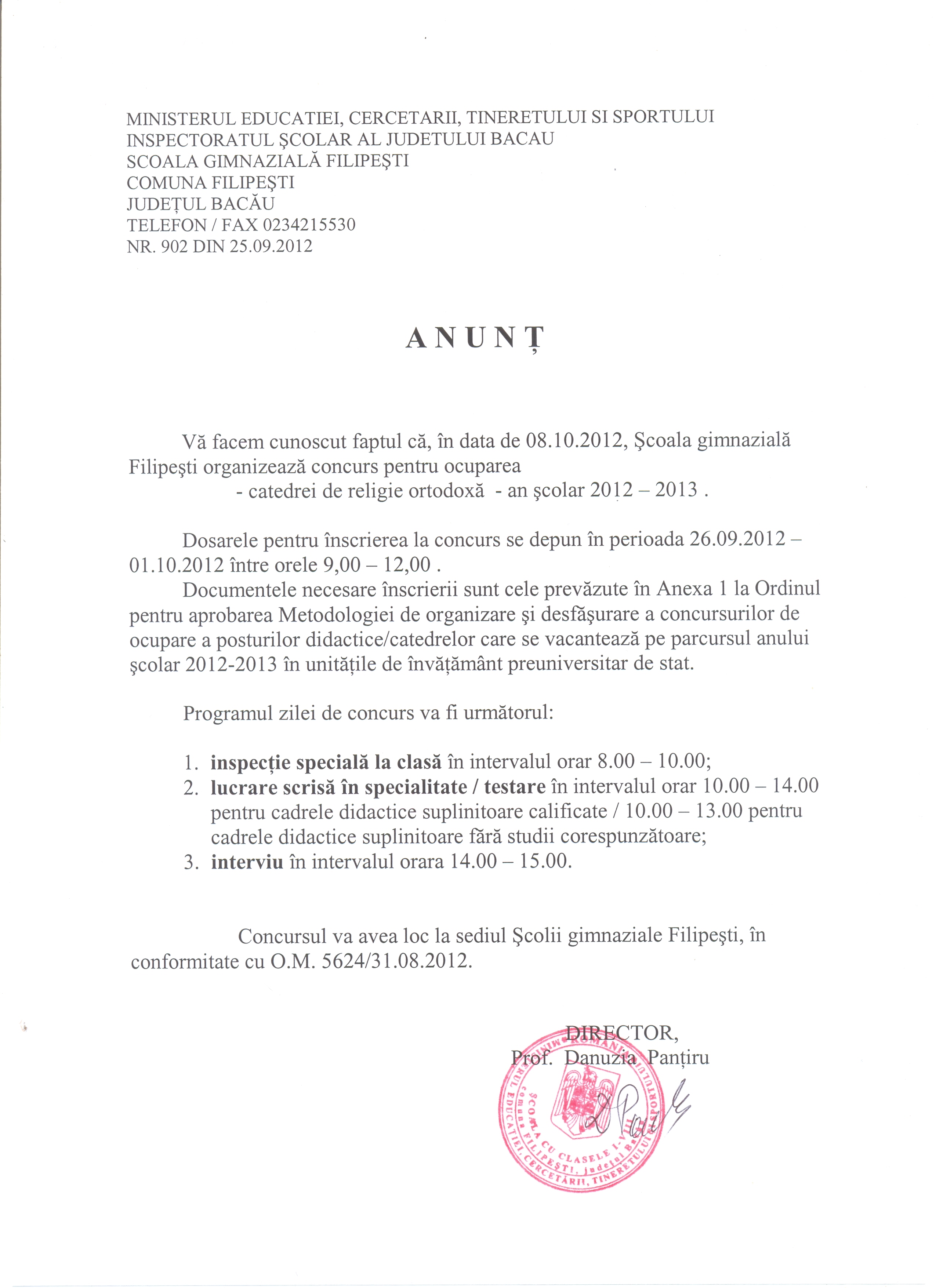 Anunț concurs ocupare posturi didactice/catedre Școala Gimnazială Filipești