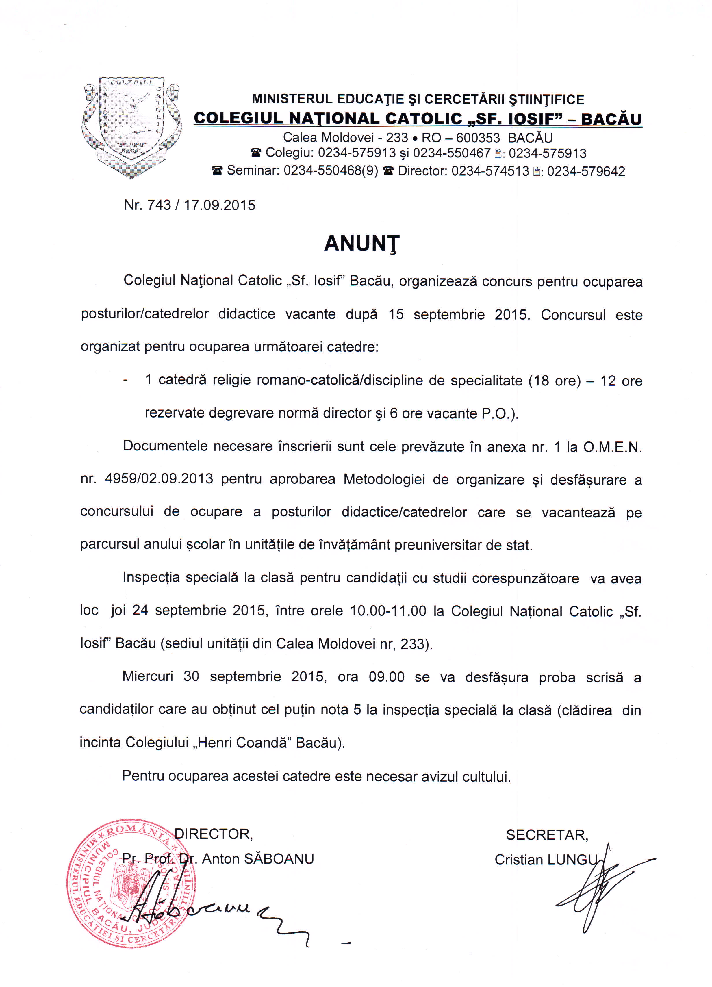 C.N. CATOLIC "SF. IOSIF" BACAU - ANUNT CONCURS PENTRU CATEDRA DE RELIGIE ROMANO CATOLICA