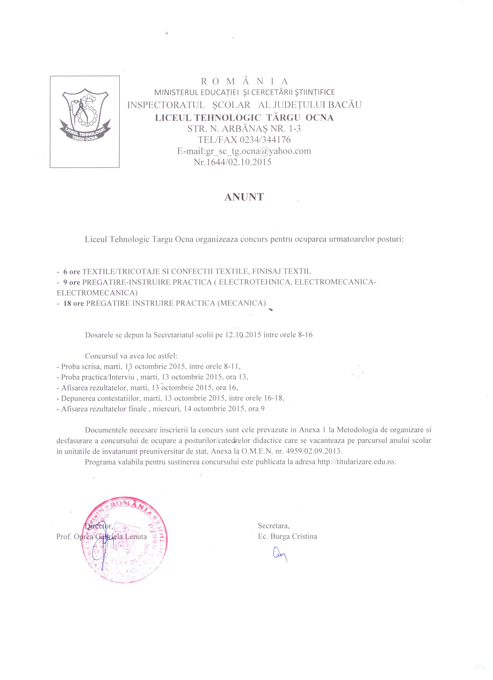 LICEUL TEHNOLOGIC TG. OCNA - ANUNT CONCURS
