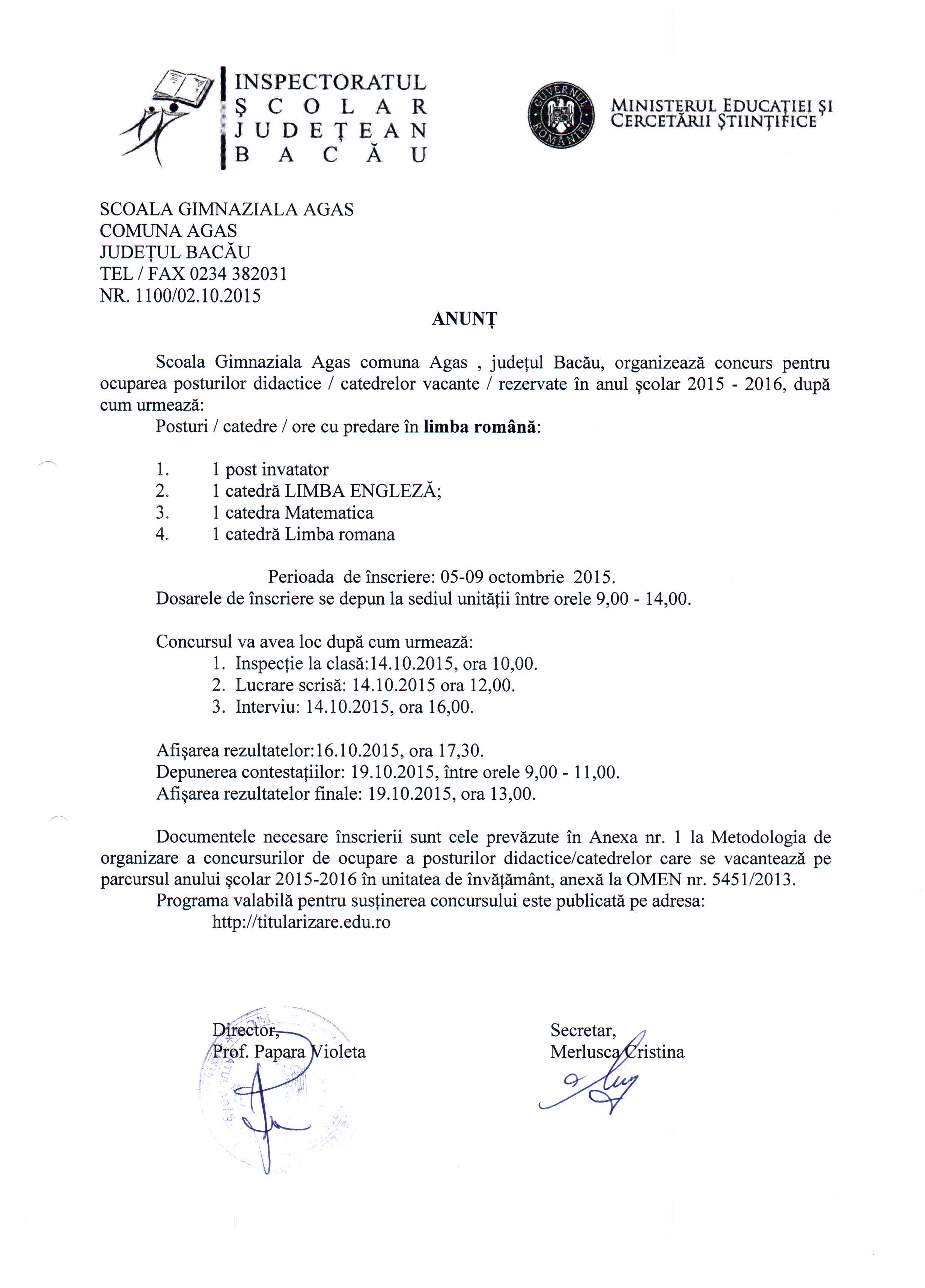 SCOALA GIMNAZIALA AGAS - ANUNT CONCURS