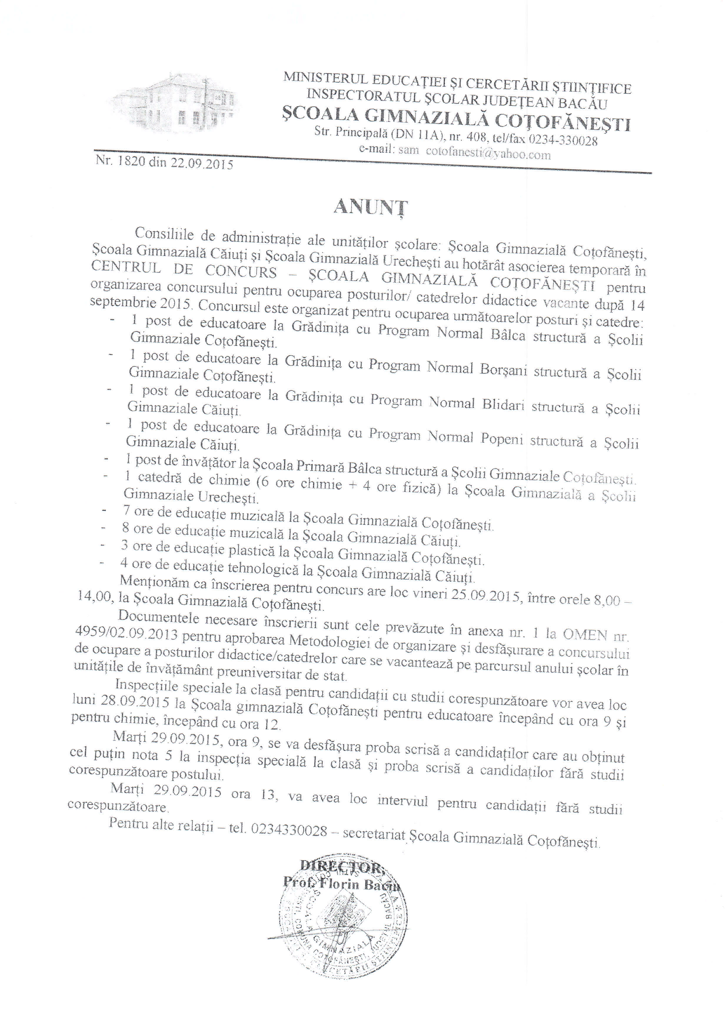 SCOALA GIMNAZIALA COTOFANESTI+SCOALA GIMNAZIALA CAIUTI+SCOALA GIMNAZIALA URECHESTI - ANUNT CONCURS