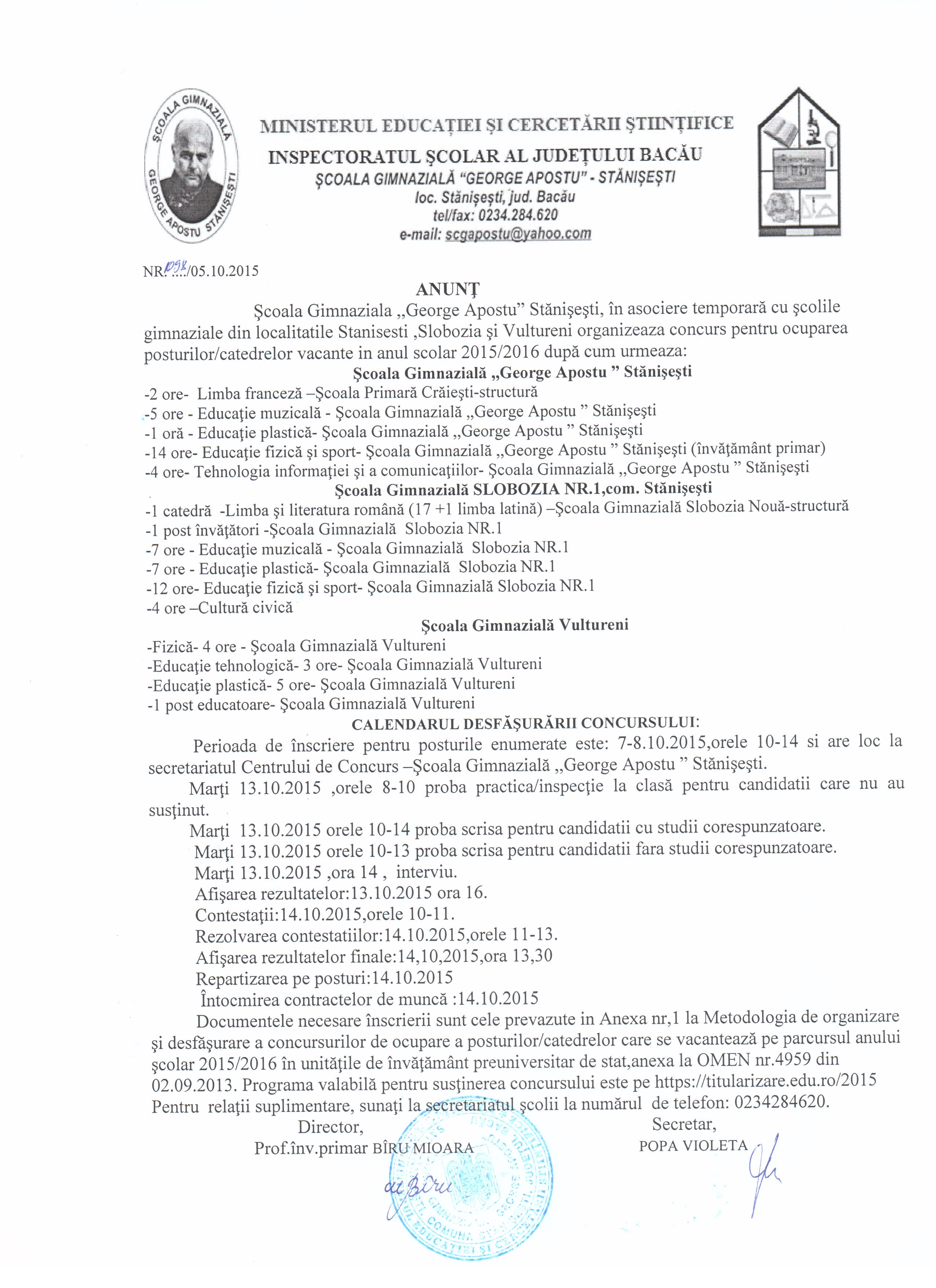 SCOALA GIMNAZIALA "G. APOSTU" STANISESTI-ANUNT CONCURS
