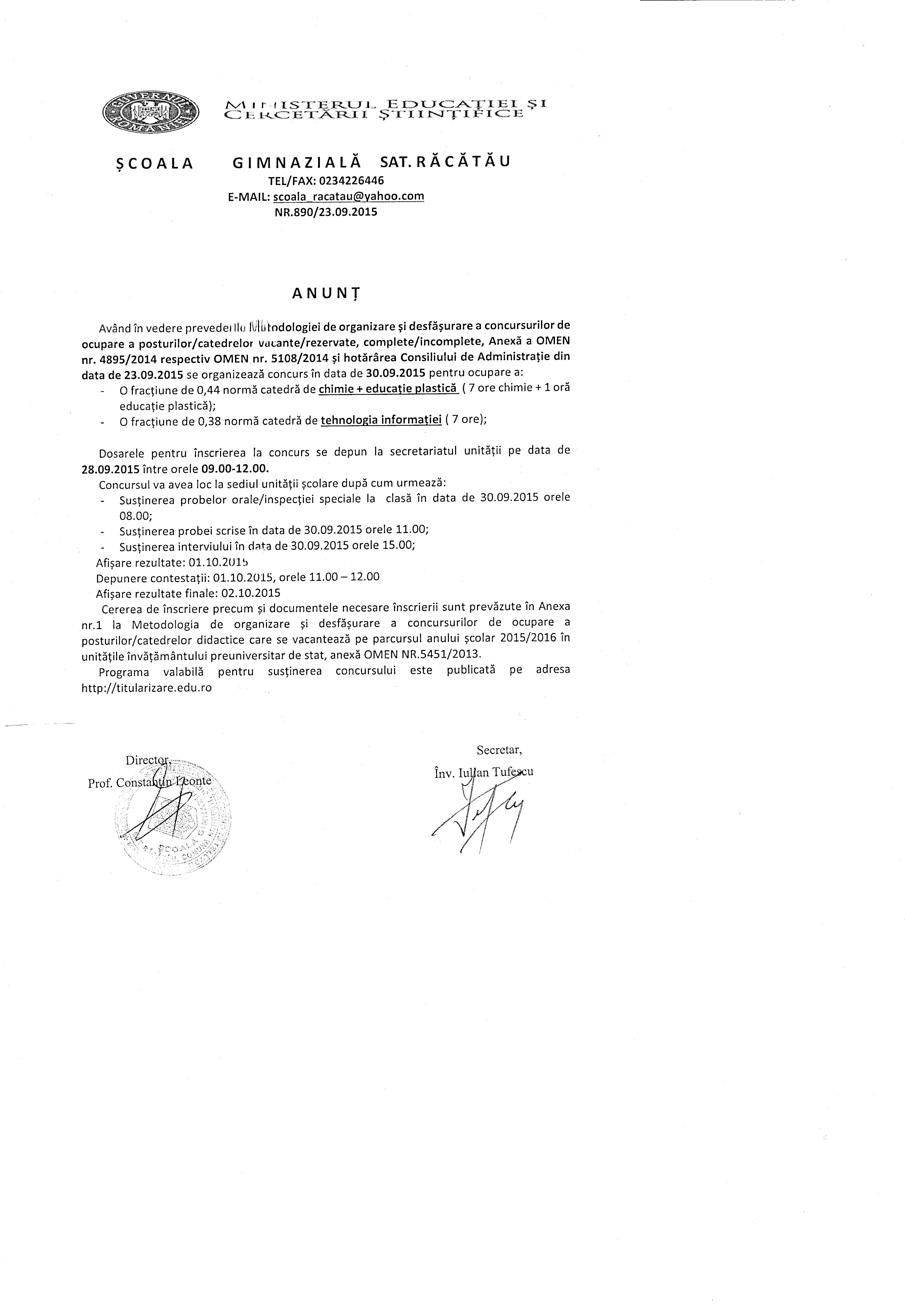 SCOALA GIMNAZIALA RACATAU COM. HORGESTI -ANUNT CONCURS