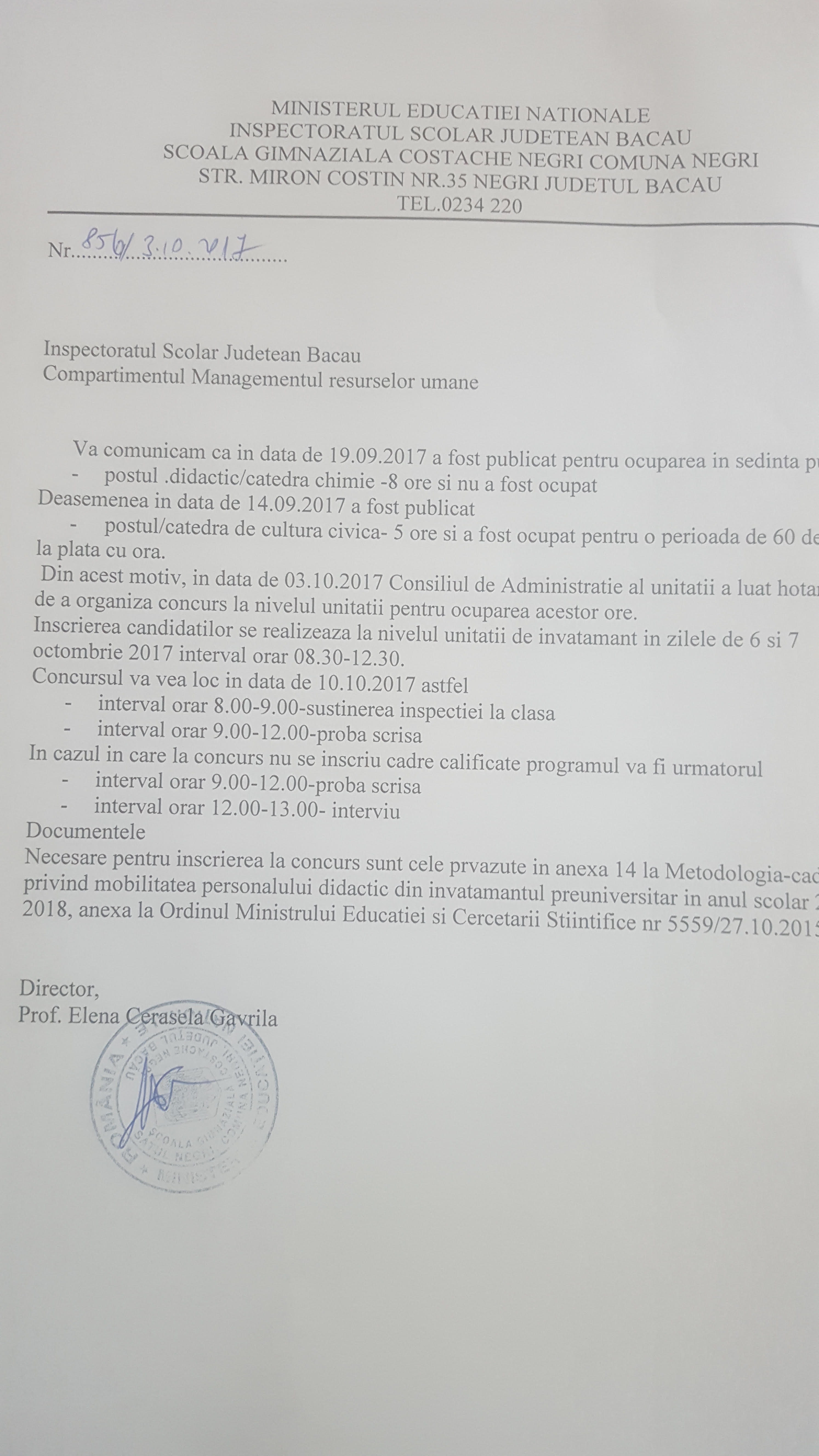 Anunt concurs - Scoala Gimnaziala ”C. NEGRI” Negri