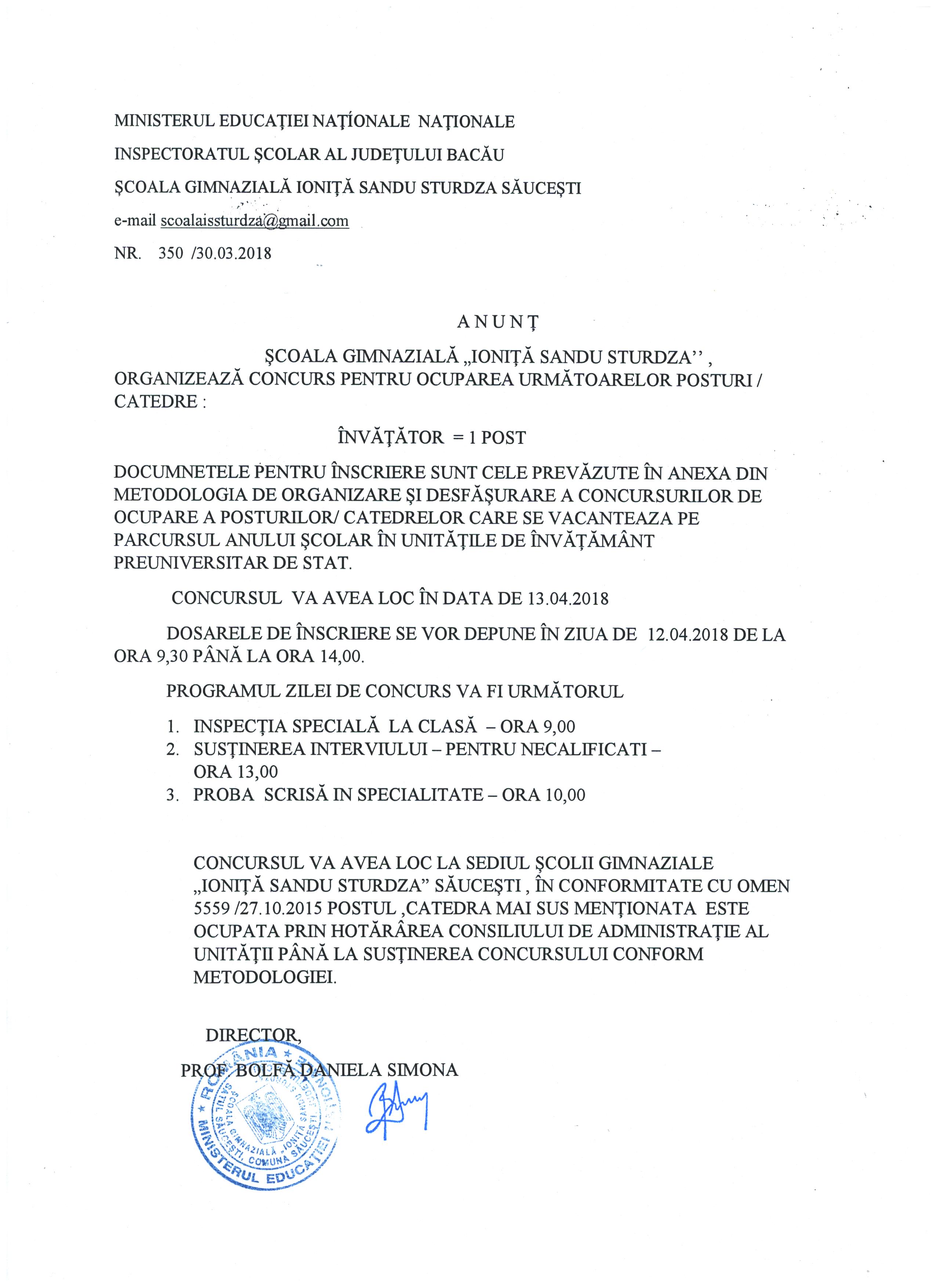 Anunt concurs - Scoala Gimnaziala ”Ionita Sandu Sturdza” Saucesti