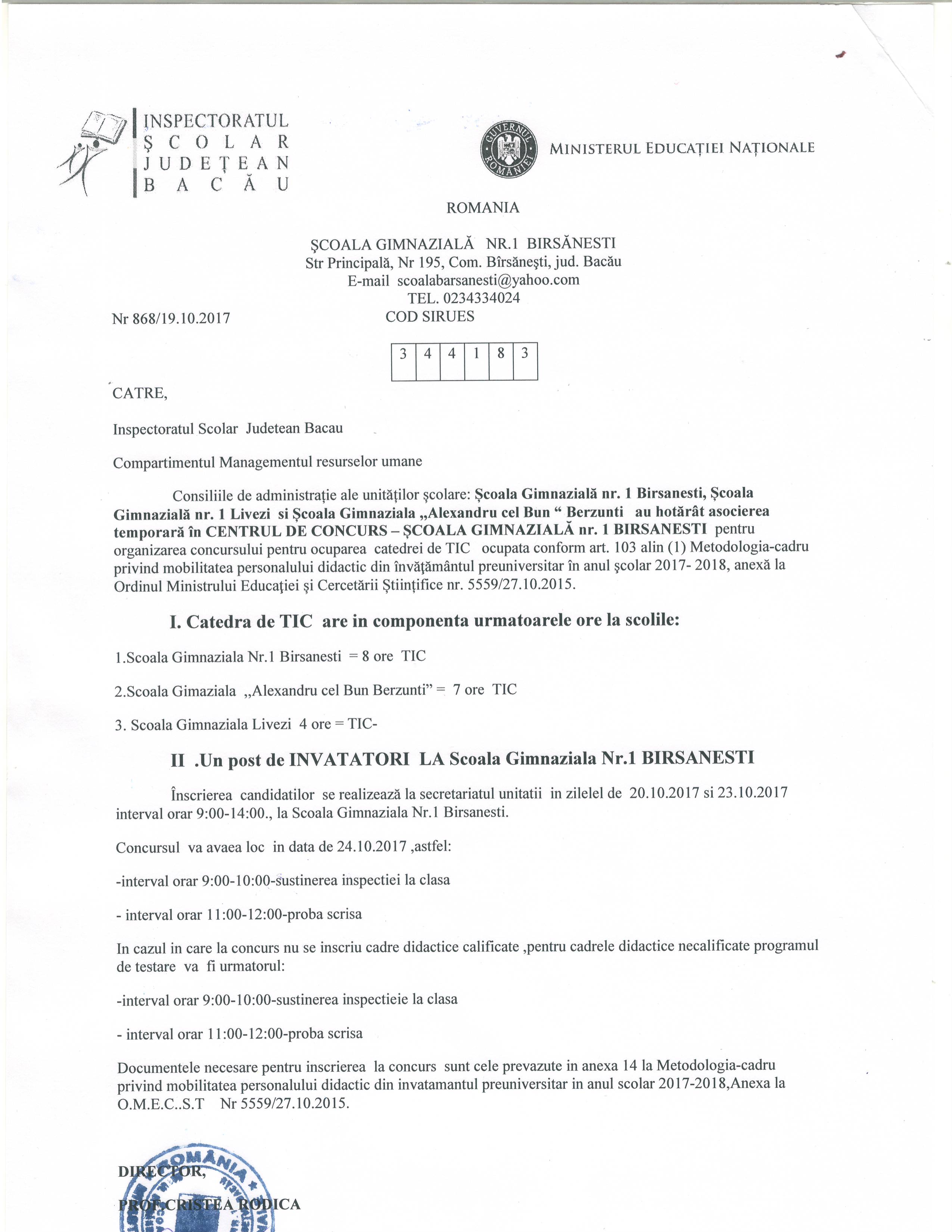 Anunt concurs - Scoala Gimnaziala nr. 1 Birsanesti
