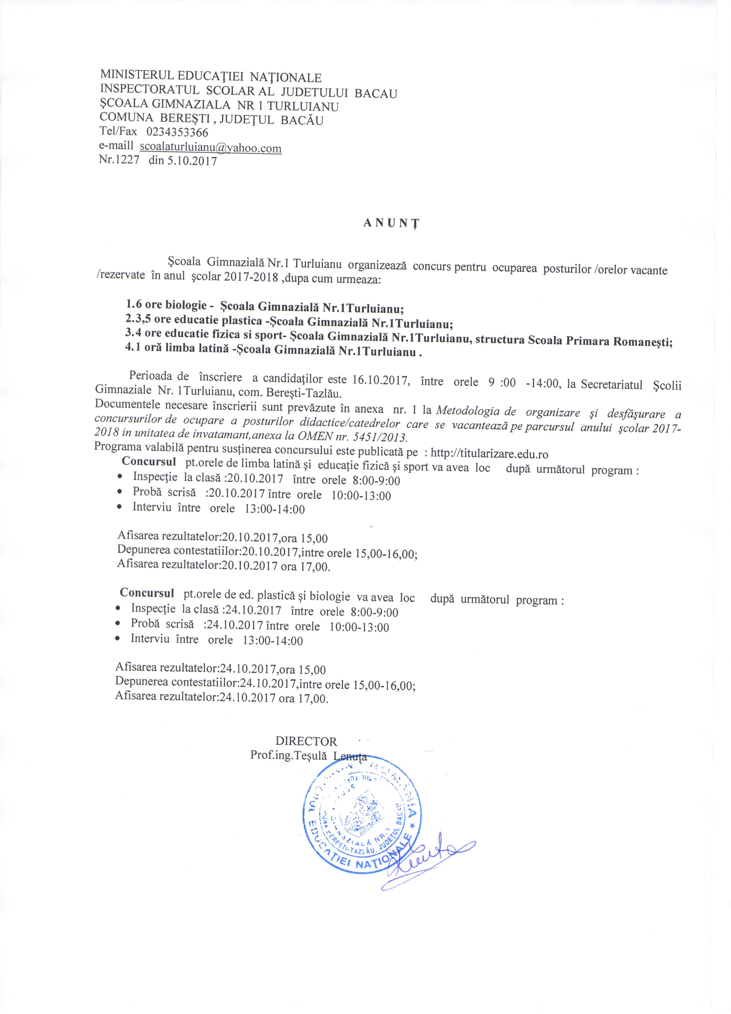 Anunt concurs - Scoala Gimnaziala nr. 1 Turluianu