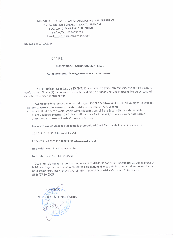 Anunt concurs - Scoala Gimnaziala Buciumi
