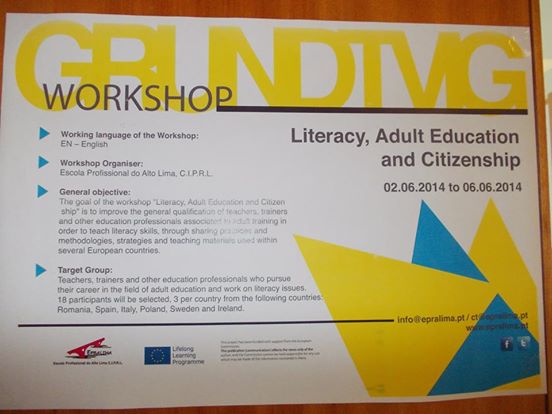 Am participat la workshop-ul internațional Grundtvig “ Literacy, Adult Education and Citizenship” care s-a desfășurat in perioada 02 – 06 Iunie 2014 in Portugalia. Workshop-ul, finanțat cu sprijinul Comisiei Europene prin Programul de Invatare pe tot Parcursul Vieții, promovează educația adulților si coeziunea sociala in Uniunea Europeana, precum si importanta utilizării documentelor si politicilor europene in domeniu. Workshop-ul internațional a implicat organizații si instituții de impact la nivel european cu activitate in domeniul educației adulților, reprezentate in Portugalia de 18 formatori cu expertiza in domeniu din 5 state ( Italia, Irlanda, Polonia, Romania, Spania). Programul de formare se adresează profesioniștilor implicați in educația adulților, interesați in creșterea calitatii parteneriatelor intre organizații si instituții implicate in educația adulților in Europa, dezvoltarea de practici inovative in educarea adulților si realizarea unui transfer de inovație intre instituțiile implicate in educația adulților la nivel european, precum si de imbunatatirea abordării pedagogice si managementul organizațiilor ce lucrează in domeniul educației adulților.
