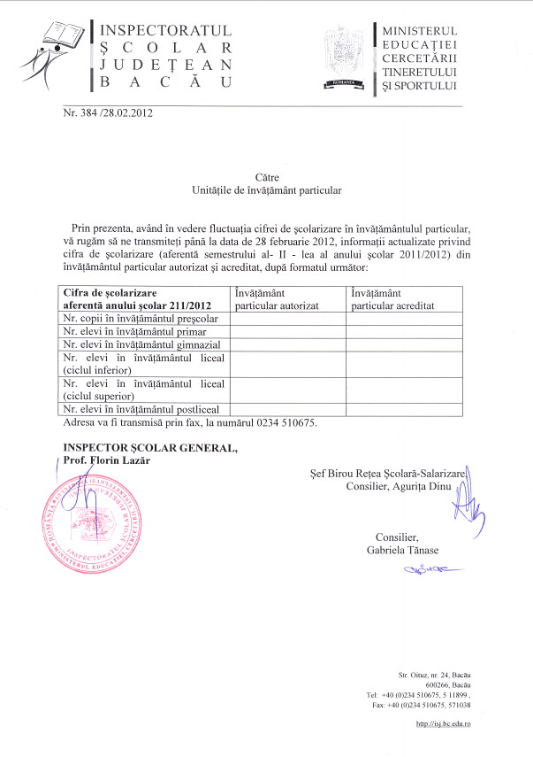 Urgent! Catre unitatile de invatamant particulare
