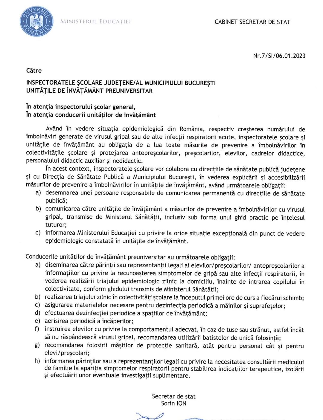 Reînceperea cursurilor în învățământul preuniversitar, pe 9 ianuarie 2023, presupune o atenție sporită în ceea ce privește ambientul școlar și condițiile în care se desfășoară procesul didactic mai ales în contextul instituirii, la nivel național, a stării de alertă epidemiologică determinate de gripă.