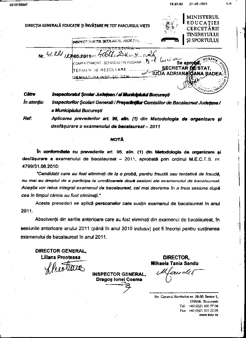 IMPORTANT! NOTA MECTS NR.41221/27.05.2011 PRIVIND APLICAREA ART.96, ALIN.(1) DIN METODOLOGIA DE ORGANIZARE SI DESFASURARE A EXAMENULUI DE BACALAUREAT 2011